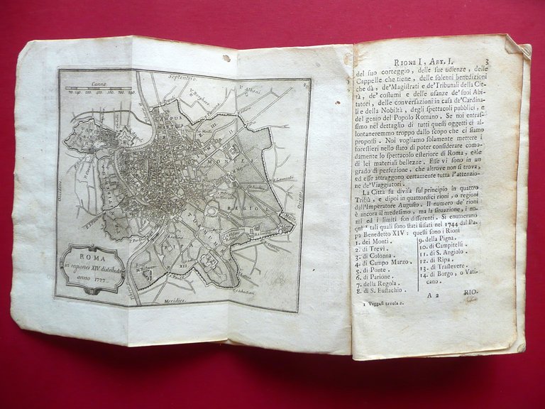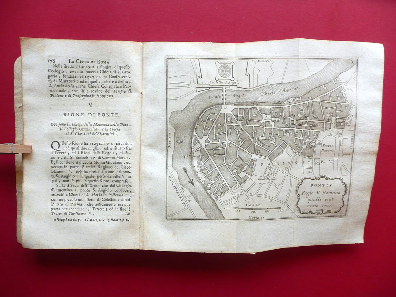 Settecentina, La Città di Roma ovvero breve descrizione di questa superba città con due piante generali, e quelle de' suoi quattordici Rioni, incisi in rame per comodo de' forestieri parte prima - seconda Nella Stamperia di Generoso Salomoni, in Roma 1779; cm 18,5x10,5; pp. 234 (parte prima); da pagina 235 a pagina 446 (parte seconda), più in totale 15 belle piante incise in b/n fuori t., tutte ripiegate più volte (vedi foto). Mancanza del dorso, del frontespizio della parte prima e di una carta in b/n. Condizioni di conservazione Esemplare in discrete condizioni con tracce d'uso e del tempo; mancanza del dorso con conseguente distacco del piatto ant., cuciture lievemente allentate ma esemplare complessivamente compatto grazie alle cuciture (vedi foto); piatti con alcune leggere abrasioni, aloni e qualche piccola mancanza. Pagine complessivamente ben conservate con alcune piccole leggere / lievi bruniture; alcune pagine con piccoli leggeri aloni e/o ombre di gore che non compromettono il testo; angolo inf. delle pp. 307-310 con una piccola mancanza. Alcuni angoli con minime pieghette. Retro di alcune carte con vecchie annotazioni d'epoca. Mancanza del frontespizio e di una carta incisa in bianco e nero. Rara guida settecentesca della città di Roma, corredata da 15 belle piante incise in bianco e nero, 14 delle quali illustrano i rioni cittadini allora esistenti. Mancanza di una carta in bianco e nero e del frontespizio della parte prima. Parte prima e seconda. In condizioni come da foto e da descrizione. SETT76.L17395 N P