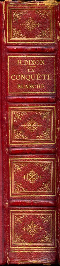 In-8° (240x155mm), pp. (4), 547, legatura coeva m. pelle rossa con titolo, filetti e ricchi fregi in oro su dorso a nervetti. Piatti in percallina rossa con bordure plurime a secco. Tagli dorati. 2 carte geografiche incise in litografia da Erhard ripiegate f.t., una della California centrale e una generale del territorio degli Stati Uniti. 118 incisioni in xilografia n.t. e f.t. Piccoli restauri a cuffie e cerniere. Bell'esemplare. Prima traduzione francese, dovuta a Hippolyte Vattemaire, di 'The White Conquest' (London, 1876), ampio libro di viaggio in tutto il territorio degli Stati Uniti, ricco di interessanti notazioni e considerazioni sugli indiani d'America, le missioni cattoliche, i mormoni, l'emigrazione cinese, l'istruzione, la popolazione di colore, la vita politica, culturale ed economica. Fra le località statunitensi toccate nell'itinerario: San Francisco, il Nevada, lo Utah, l'Oklahoma, il Texas, il Golfo del Messico, la Louisiana, la Georgia, il South Carolina e Charleston, la Virginia, Washington, Philadelphia, etc. Il Dixon (Manchester, 1821-Londra, 1879) fu fecondo scrittore di libri di viaggio, giornalista e storico, collaboratore di periodici e di quotidiani come l'Athenaeum', il 'Daily News', etc., dimostrandosi tra l'altro un sensibile critico del sistema penale britannico e delle condizioni carcerarie del tempo. Sabin, 20373.