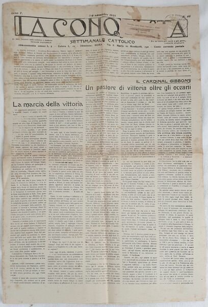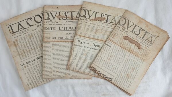 Lotto di quattro numeri del settimanale cattolico "La conquista" dell'anno 1918: 13 ottobre, 20 ottobre, 3-9 novembre, 10 novembre. Tra gli articoli presenti: Cristo Patria Democrazia nel pensiero di Giuseppe Toniolo, Il passo dell'uscio, S. Francesco e la guerra, Opinione di De Maistre sulla scomparsa dell'Austria dal punto di vista religioso, Renan e San Francesco, Il clero e le cinque giornate di Milano, Come si fanno gli armistizi, La via della vittoria, Le porte d'Italia all'Italia, I santi delle terre redente, Il Caridnale Gibbons, Rolando Barraud, La polemica socialista ecco il punto ecc. In buone condizioni Raro. Brossura editoriale in buone condizioni generali con lievi usure ai margini e dorso. Piegature e resti di etichetta. Pagine in buone condizioni con rare fioriture. Piegature. In folio. Dim. 50x35 cm. Pp. 4 cad.Lot of four numbers of the catholic weekly magazine "La conquista" of the year 1918: 13rd of october, 20th of october, 3-9rd of november, 10th of november. The artivles inside: Christ Patriot Democracy in the thought of Giuseppe Toniolo, S. Francesco and th war, Opinion of De Maistre about the desappearing of Austria from a religious point of view, Renan and San Francesco, the clergy and cinque giornate di Milano, Route of victory, Italian doors to Italy, Cardinal Gibbons, Rolando Barraud, Socialist polemics ecc. In good conditions. Editorial cover in good general conditions slightly worn in the edges and spine with signs of labels. Foldings. Inside pages are in good conditions with foxing. Foldings. In folio. Dim. 50x35 cm. Pp. 4 cad.