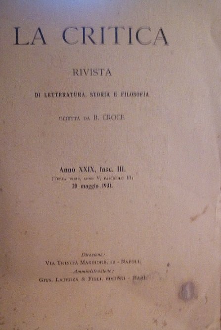 LA CRITICA - RIVISTA DI LETTERATURA, STORIA E FILOSOFIA DIRETTA DA B. CROCE - ANNO XXIX, FASC. III - 20 MAGGIO 1931