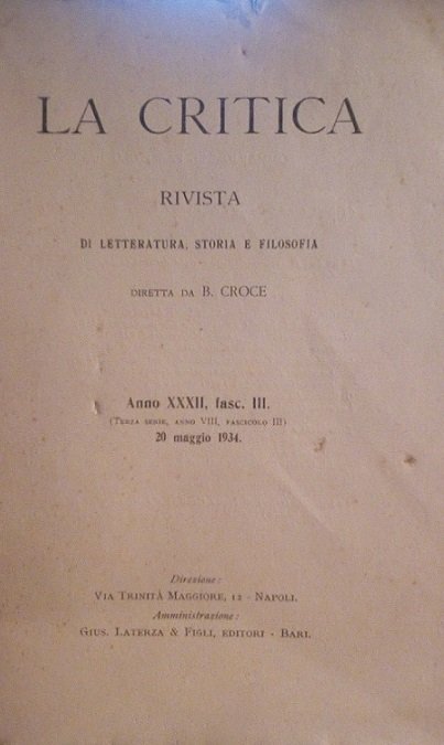 LA CRITICA - RIVISTA DI LETTERATURA, STORIA E FILOSOFIA DIRETTA DA B. CROCE - ANNO XXXII, FASC. III - 20 MAGGIO 1934