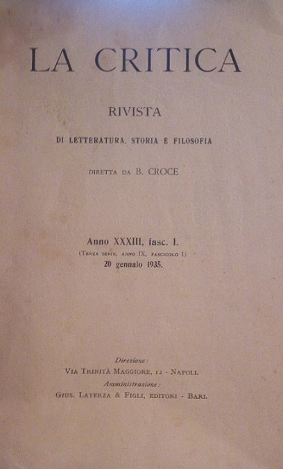 LA CRITICA - RIVISTA DI LETTERATURA, STORIA E FILOSOFIA DIRETTA DA B. CROCE - ANNO XXXIII, FASC.I - 20 GENNAIO 1935