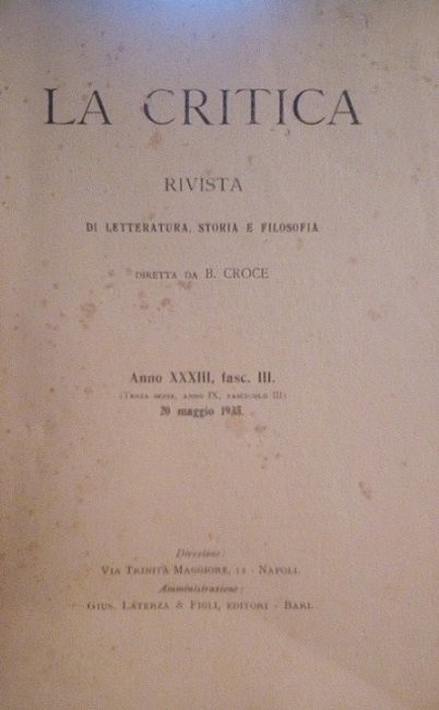 LA CRITICA - RIVISTA DI LETTERATURA, STORIA E FILOSOFIA DIRETTA DA B. CROCE - ANNO XXXIII, FASC.III - 20 MAGGIO 1935