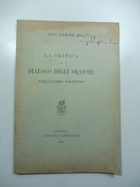 In 8 (cm 15,5 x 22,5), pp. 38. Dedica autografa in parte cancellata al piatto anteriore. Estratto editoriale. Saggio di critica letteraria relativa al Dialogo attribuito a Tacito.