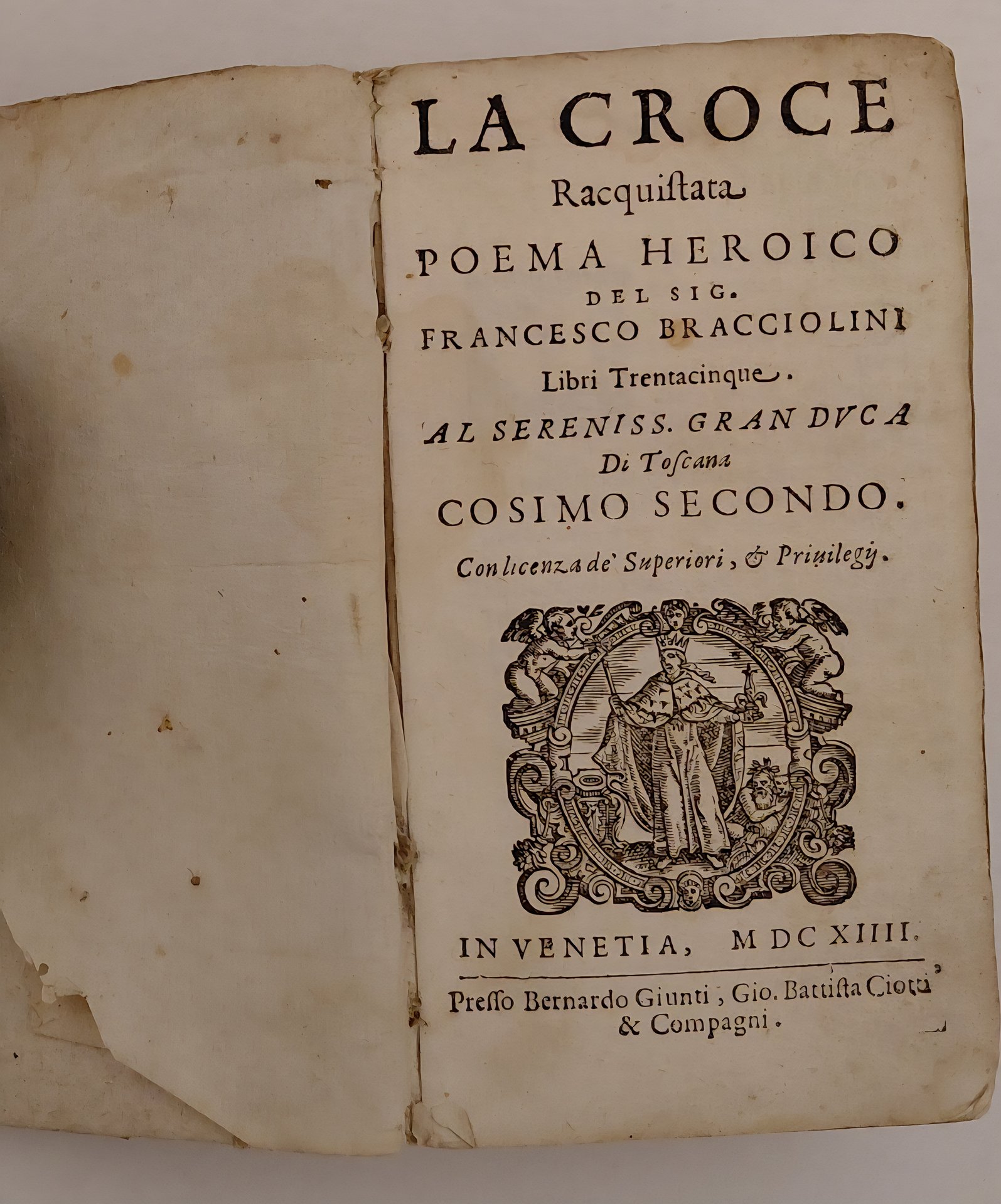 In 16o, pagg. (24) 720, pergamena con nervi, impresa dello stampatore al frontespizio (la Toscana), capolettera e fregi incisi. Ristampa dell'edizione definitiva, apparsa a Venezia presso il Ciotti nel 1611, in 35 canti, mentre la prima edizione (Parigi 1605) ne comprendeva soltanto 15. Mancanza alla parte posteriore della legatura e agli angoli inferiori delle carte bianche, tracce di tarlo ad una trentina di carte, ma buon esemplare (05714/FRANCESCO BRACCIOLINI)