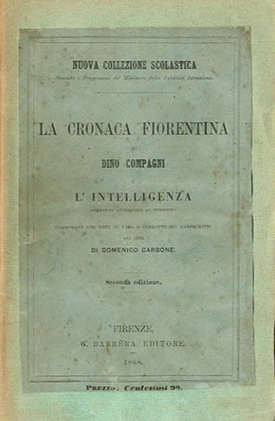 2. ed. XVI, 201 p. ; 19 x 12 cm. Nuova collezione scolastica. La "Cronica" del Compagni riacquista tutta la sua importanza come opera d'arte e come uno dei primi monumenti della prosa toscana del Trecento; come fonte storica, essa è nuovamente rimessa in onore per tutto ciò che si riferisce alle lotte dei partiti fiorentini; e pieno omaggio le è reso perciò dagli storici più recenti e autorevoli, che, ristudiando sui documenti i fatti dal 1293, la congiura contro Giano della Bella, e le lotte fra bianchi e neri, han finito per ammirare la precisione di tutte le notizie del Compagni e per meravigliarsi che in altri tempi lo si sia potuto prendere per un falsario. Il volume contiene «L'Intelligenza», poema allegorico in nona rima composto a cavallo tra '200 e '300 da anonimo fiorentino, tradizionalmente attribuito a Dino Compani. Opere illustrate con note di vari e corrette sui manoscritti per cura di Domenico Carbone. Brossura non editoriale, copertina in cartoncino flessibile, con incollata parte della coperta originale. Segni del tempo alla coperta e alle pagine interne (ingiallimento), per il resto libro accettabile. Codice libreria 4994.
