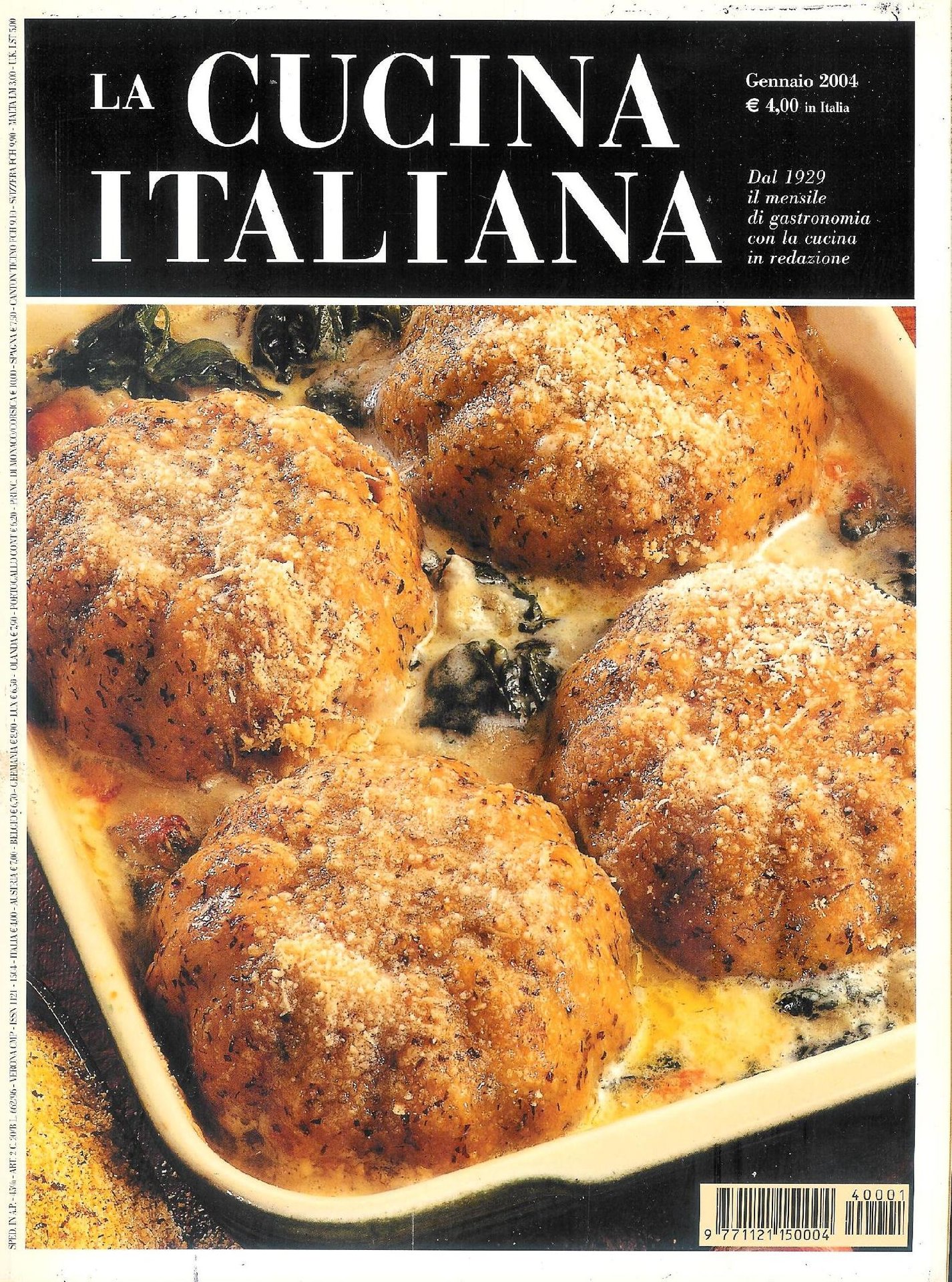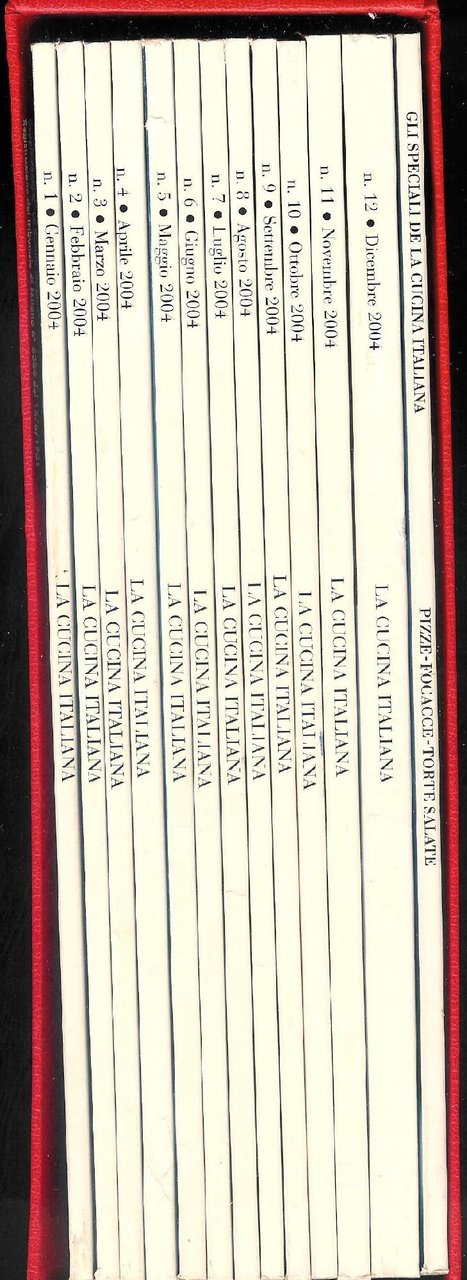 "La Cucina Italiana" è dal 1929 il più autorevole mensile di gastronomia e di cultura alimentare. Gode della più lunga tradizione sia in in Italia che nel resto del mondo. E' ricchissimo non solo di ricette (con bellissime foto a colori) ma anche di rubriche, segnalazioni di nuove tendenze, novità di cucina e consigli per la casa. Quest'annata (2004) oltre alle pubblicazioni mensili complete (da gennaio a dicembre) include la pubblicazione "Pizze-Focacce-Torte Salate" . Tutte le pubblicazioni sono raccolte in un cofanetto color rosso . in quarto Molto buono (Very Good) In ottima condizione in ogni sua parte.