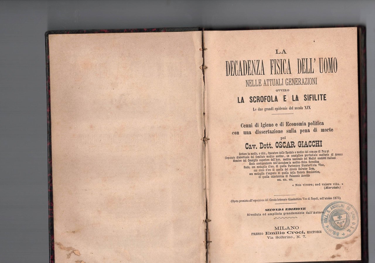 In 16° ril. mez. tela, pp.175 .Cenni di igiene e di economia politica con una dissertazione sulla pena di morte.Opera premiata all'esposizione del circolo letterario Giambattista Vico di Napoli nell'ottobre del 1875.