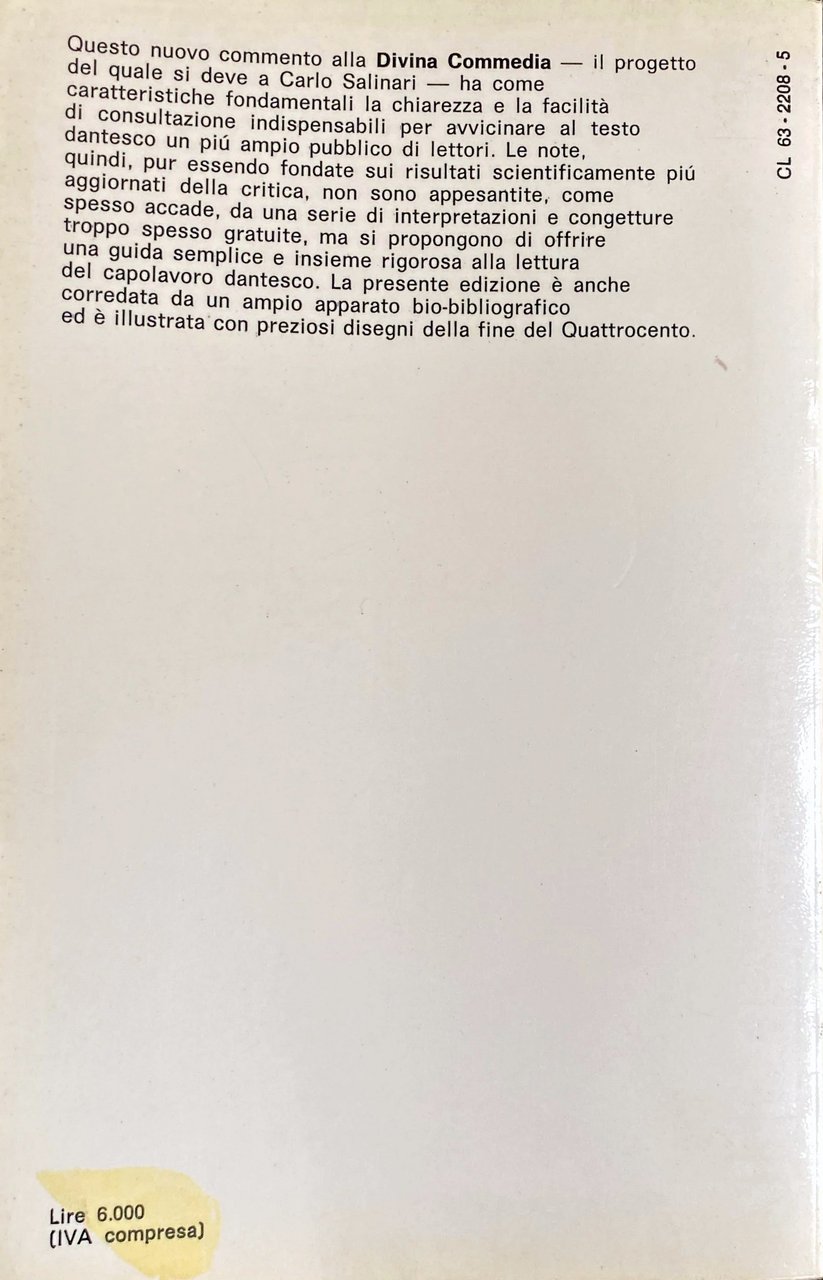 Questo nuovo commento alla Divina Commedia il progetto del quale si deve a Carlo Salinari ha come caratteristiche fondamentali la chiarezza e la facilità di consultazione indispensabili per avvicinare al testo dantesco un più ampio pubblico di lettori. Le note, quindi, pur essendo fondate sui risultati scientificamente più aggiornati della critica, non sono appesantite, come spesso accade, da una serie di interpretazioni e congetture troppo spesso gratuite, ma si propongono di offrire una guida semplice e insieme rigorosa alla lettura del capolavoro dantesco. La presente edizione è anche corredata da un ampio apparato bio-bibliografico ed è illustrata con preziosi disegni della fine del Quattrocento.