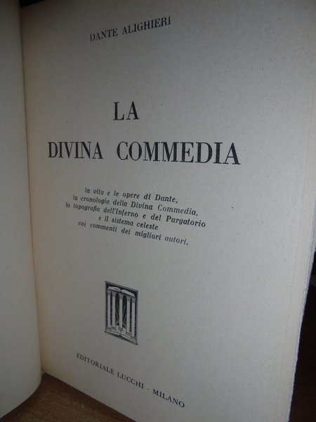 La vita e le opere di Dante, la cronologia della Divina Commedia, la topografia dell' Inferno e del Purgatorio e il sistema celeste coi commenti dei migliori autori. Dante, Alighieri - Milano, Editoriale Lucchi, 1964. In - 16°, cartoncino illustrato, 583 pp. con 32 tavole fuori testo. Libro ben conservato. Neg. mob. nero