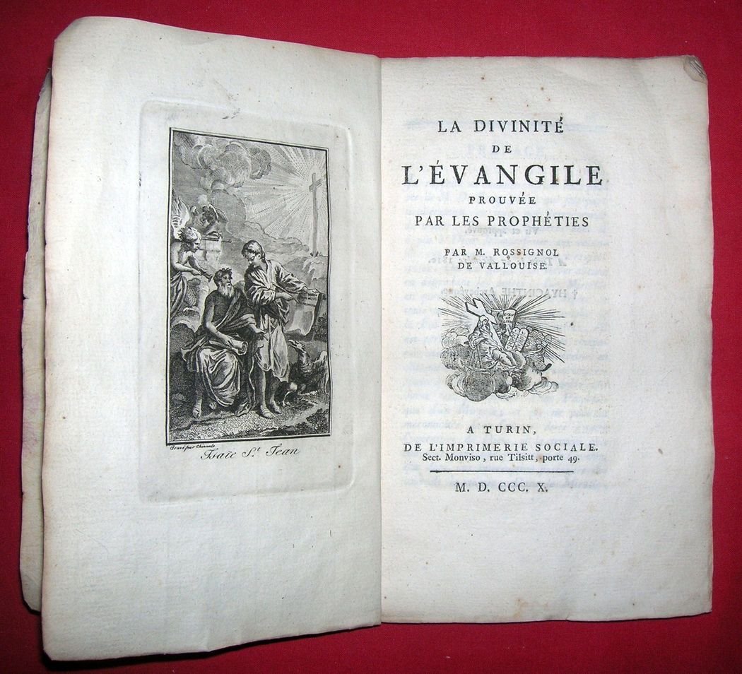 In -8, pp. XIV - 80. Antiporta figurato (inc. Chianale) raffigurante il profeta Elia e S. Giovanni. Marca tipografica sul frontespizio. Brossura muta rosa originale. Ottimo esemplare. Rossignol de Vallouise, gesuita, fu letterato e professore di fisica e di matematica. Pubblicò opere di argomento scientifico e diverse opere dedicate allo studio delle profezie e dei miracoli.