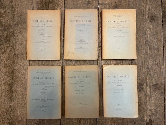 6 volumi (309; 464; 556; 453; 355; 319 pagine); 25 cm. Brossura editoriale. Tracce d'uso, qualche strappo e qualche piccola mancanza alle copertine, tagli polverosi, dorsi e margini delle copertine bruniti e carta fragile, ingiallita, a volte brunita. La più importante opera teosofica in edizione francese, omogenea nella veste editoriale anche se i vari volumi sono di edizioni e date diverse. I capitoli principali: Cosmogénèse, Evolution du symbolisme, Science occulte et science moderne, Anthropogénèse, Le symbolisme archaique des religions