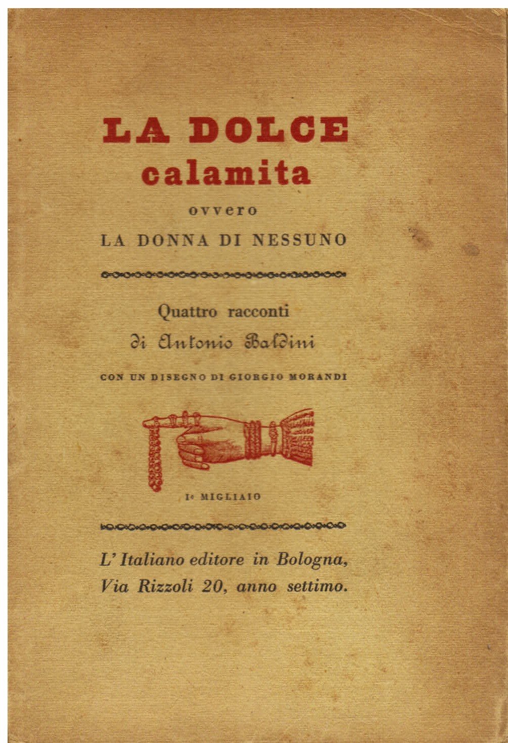 In-16° grande, pp. 290, (2), brossura editoriale con titolo in rosso e in nero e vignetta in rosso al piatto. All'antiporta, riproduzione di un disegno di Morandi ritraente Baldini. 30 testatine di Leo Longanesi in b.n. n.t. Bell'esemplare in barbe. Edizione originale (1° migliaio). Il testo venne successivamente inglobato in 'Beato tra le donne'. Gambetti / Vezzosi, p. 1007. Spaducci, p. 27.