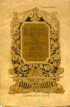 In-16° grande, pp. 311, (4), brossura pergamenata incamiciata con titolo entro elegante bordura bicroma disegnata da D. Tofani a motivi floreali e ornamentali. 13 tavv. f.t. Perfetto stato; in parte intonso. Seconda edizione di questo importante studio del grande erudito fiorentino. Il Del Lungo acclara l'ascesa del comune di Firenze e il ruolo delle donne nella vita sociale della Firenze medioevale, soprattutto ai tempi di Dante e del Boccaccio (qui assume un ruolo fondamentale lo studio della figura di Beatrice e la sua identificazione storica), e nella vita cittadina della Rinascenza; ampi capitoli vengono consacrati alle lettere di una matrona del Rinascimento, Isabella Sacchetti Guicciardini, e ad una missiva di Alessandra Mancinghi Strozzi conservata agli Archivi di Stato di Firenze. Il Del Lungo (Montevarchi, 1841-Firenze, 1927) fu uno di più grandi dantisti e studiosi di storia letteraria e filologia italiana, presidente della Società Dantesca e della Crusca, amico del Carducci, Senatore dal 1906, indefesso editore di antichi testi da lui per la prima volta editi e restituiti alla corretta lezione critica (tra tutti la 'Cronica' del Compagni) secondo i precetti del 'metodo storico' di cui fu uno dei massimi esponenti. Cfr., sul Del Lungo, Guido Mazzoni in Encicl. Italiana, XII, 561 e A. Piromalli ne I critici, I, Milano, 1969.