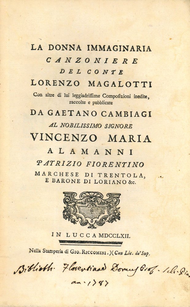 La donna immaginaria del Conte Lorenzo Magalotti Con altre di lui leggiadrissime Composizioni inedite, raccolte e pubblicate da Gaetano Cambiagi