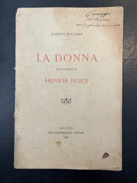 In 16 (cm 13 x 19,5), pp. 51 + (1). Omaggio manoscritto dell'editore al piatto anteriore. Qualche sporadico segno con lapis blu ai margini del testo. Danni riparati al dorso. Brossura editoriale. Edizione originale di questo saggio, di cui esiste una ristampa del 1999, di Alberto Boccardi, figura di spicco della cultura triestina del secondo Ottocento e del primo Novecento tant'e' che Silvio Benco, nella sua guida di Trieste, lo affianco' ad Italo Svevo tra gli autori del romanzo di "analisi". Critico teatrale, fu anche autore di commedie e drammi. Il teatro di Ibsen giunse in Italia nel 1889 quando, a Torino, Emilia Aliprandi interpreto' "Casa di bambola". Ma fu senza dubbio la prova di Eleonora Duse, due anni piu' tardi, a far accendere il dibattito in Italia sul teatro del drammaturgo norvegese. Anche a Trieste si sviluppo' un pensiero critico sul teatro ibseniano, ma gli intellettuali cittadini, che avevano gia' conosciuto Ibsen sulle scene tedesche, ed erano figli di una cultura mitteleuropea, aprirono la strada alla comprensione del teatro dell'autore scandinavo. Tra questi il saggio di Boccardi, gli interventi critici di Silvio Benco e di Carlo Michelstaedter, Scipio Slataper e Federico Sternberg.