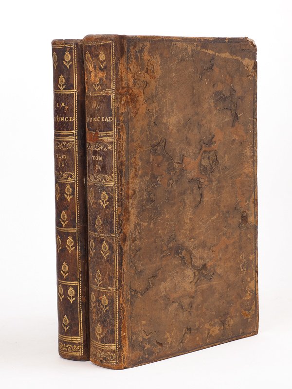 2 vol. in-8 reliure d'époque pleine basane marron, dos lisse orné, La Dunciade : A Londres, 1771, L'Homme Dangereux : Amsterdam, 1770, Tome I : 1 f. blanc, 2 ff. n. ch. (faux-titre et titre), 264 pp. ; 1 f. n. ch. (faux-titre), 199 pp., 1 f. n. ch. (errata), 1 f. blanc ; Tome II : 1 f. blanc, 348 pp. ; Complet. Deuxième édition très augmentée, bien complète des Mémoires sur la Vie de l'Auteur par Palissot lui-même, et enrichie de sa Comédie de "L'homme dangereux". Exemplaire modeste (reliure frottée avec petits manques en dos et plat, anc. mouill., bon exemplaire de travail) Quérard, VI, 564