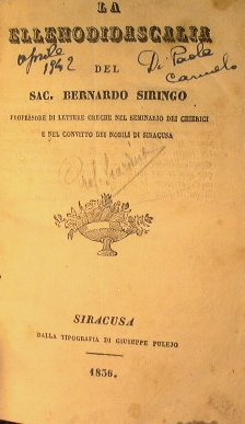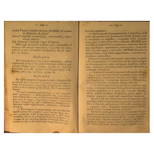 in 8° - pp.cc.2+v+pp.460+cc.2 - Mezza tela - Legatura antica ma non coeva. Buona conservazione ad eccezione di una macchia alla pag.288 che non compromette la lettura. - margini superiori corti. - Trattasi di antica grammatica greca ad uso scolastico con '…annesse tre Appendici: la prima riguarda i Dialetti,la seconda la Poesia greca,e la terza le Iscrizioni.'