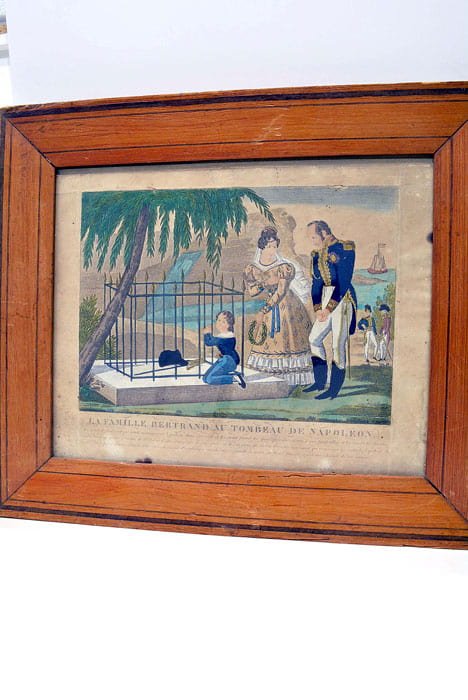 Gravure: 19x26 Cm. Cadre: 35x42 Cm. Gravure avec cadre ancien. Gravure montrant le Général Bertrand, qui avait accompagné Napoléon dans son exil. On le voit auprès du tombeau, avec son épouse et leur fils. Quelques taches et salissures. Petit accroc.