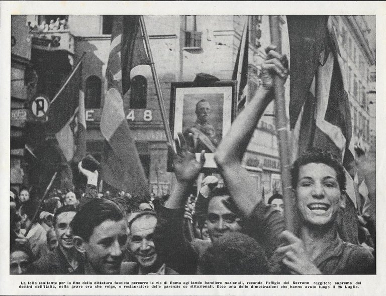 La folla esultante per la fine della dittatura fascista percorre le vie di Roma. Stampa 1943