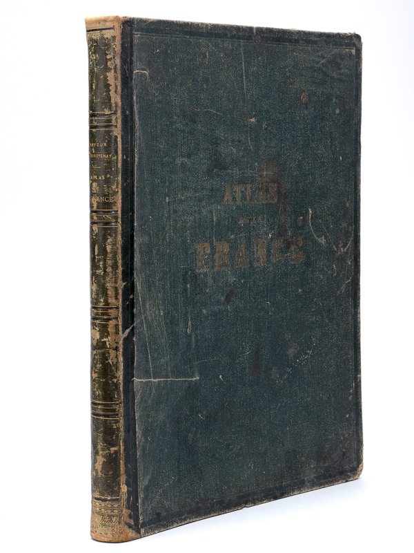 Des chemins de fer, canaux, rivières et cours d'eau, indiquant les postes aux chevaux et aux lettres, les sources d'eaux minérales, etc., Nouvelle édition, avec une notice historique sur chaque département par M. Albert Montémont, Cet atlas a été revu et augmenté par A. Vuillemin, 1 vol. in-folio (42 x 31 cm) reliure de l'époque demi-chagrin vert, Auguste Logerot, Paris, s.d. [ circa 1863 ], avec 90 feuillet et 92 cartes Rare exemplaire bien complet des 92 cartes (dont les 3 bis ou ter). Etat satisfaisant (rel. frottée, mouill. importante sur tout le corps de l'ouvrage, mais généralement très peu visible sur les cartes). Peu commun