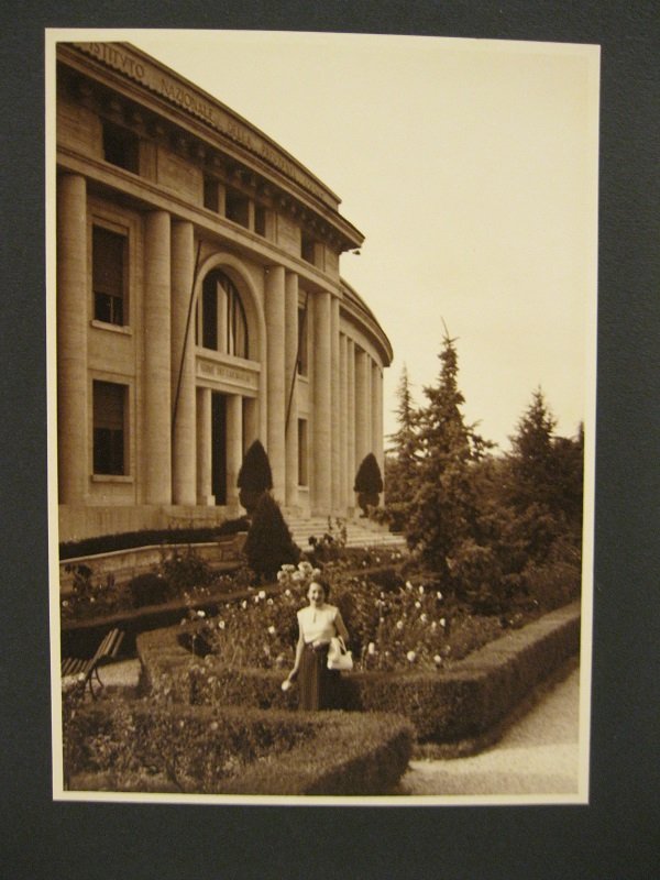 10 fotografie originali vintage in b/n, stampa alla gelatina ai sali d'argento (cm 17 x 11) montate su cartoncino bordato (cm 34 x 24,4). Didascalie dattiloscritte al verso. Le fotografie ritraggono vari scorci degli esterni dello stabilimento termale di Fratta terme presso Bertinoro. In ogni fotografia e' ritratta una donna sola o insieme ad altre persone in vestaglia da camera o abiti. Sono ritratti in particolare i giardini esterni allo stabilimento, terrazze e le scale d'ingresso alla struttura.