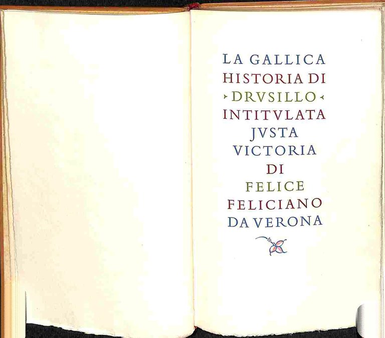In 16 (cm 10 x 17), pp. 74 + (2) + (6 bianche). Legatura editoriale in piena pelle con cornici impresse a secco ai piatti, monogramma centrale ai piatti e decori in forma di asterisco. Astuccio in cartone decorato. Uno dei 15 esemplari stampati su carta a tino della Cartiera di San Marco con rilegatura in pelle di vitello (nostro esemplare n. 14) della edizione di 132 esemplari. Pubblicazione edita da Giovanni Mardersteig di questa novella del 1474 secondo il manoscritto conservato presso la Biblioteca Riccardiana di Firenze. Stampato in carattere Janson corpo 9 tondo e corsivo, frontespizio con caratteri colorati verde, blu, rosso in vari corpi del carattere Bembo. Ottime condizioni. "Che un libretto di tanta affascinante arguzia quale La Gallica Historia di Drusillo intitulata Justa Victoria del Feliciano.fosse potuto uscire nei tempi bui della guerra era la prova che Mardersteig sapeva immergersi profondamente nel lavoro al suo torchio tenendosi al di fuori degli eventi politici". Schmoller p. XLIII.