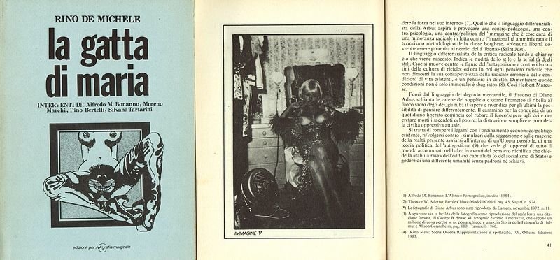 In-8°, legatura in brossura editoriale, pp. 46, con illustrazioni tratte da fotografie. -(Rino De Michele, nato a Marsala nel 1950, vive in veneto. Una sua poesia, La gatta di Maria, è il pretesto per la pubblicazione di un libretto sulla pornografia e l'oscenità. (Raro).