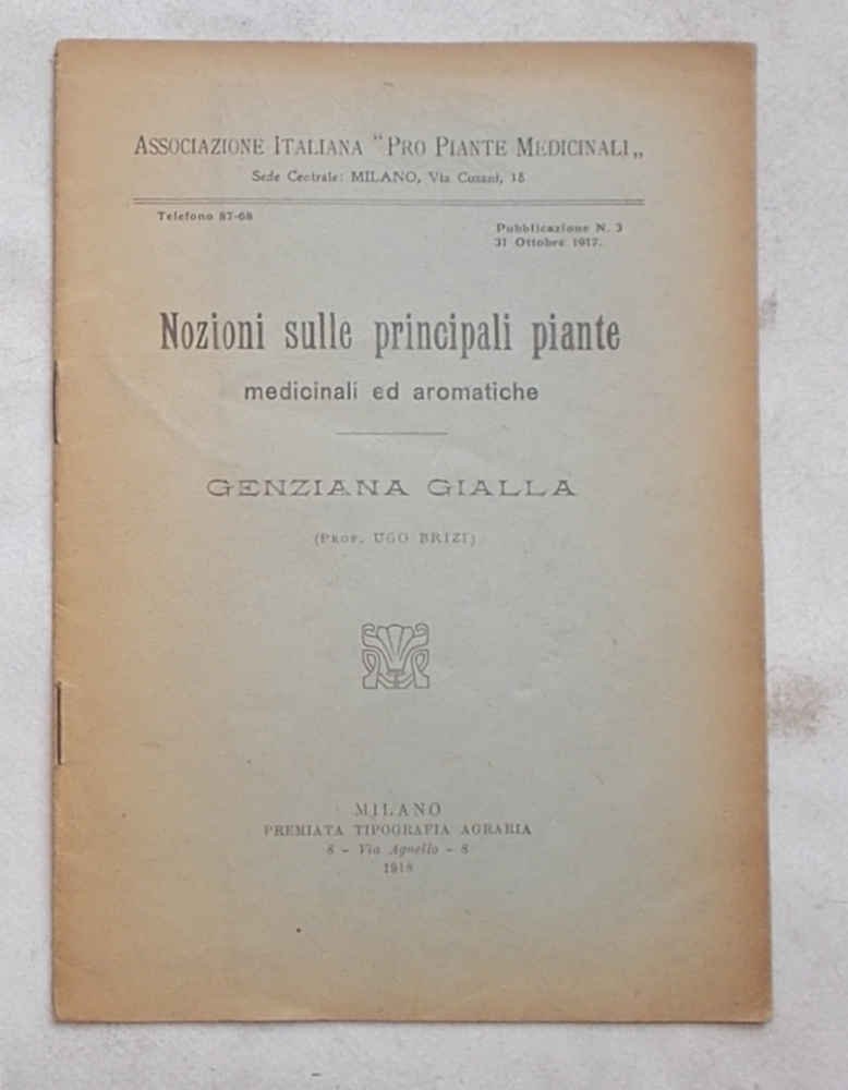 In 8° (cm. 20,5 x 14,5); pagg. 10; con 1 tavola a colori f.t.; brossura. origin. Carta scurita. VG-. ** Pubblicazione della collana "Nozioni sulle principali piante medicinali e aromatiche" n. 3. La Associazione Italiana "Pro Piante Medicinali, aromatiche od altre utili" ha per iscopo di far propaganda affinchè siano raccolte ed adoperate tutte le piante medicinali. che crescono spontanee nel nostro paese, od affinchè si coltivino. Finora questo commercio era in mano ai tedeschi, i quali sfruttavano, anche a nostro danno, le nostre ricchezze."
