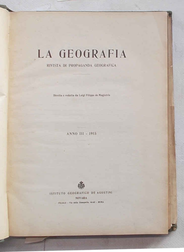 In 8° (cm. 24,5 x 17); pagg. 416, (16); con 14 tavole f.t. (4 delle quali sono carte geografiche a colori più volte ripiegate) e alcune illustraz. n.t.; m.tela dell'epoca. Carta un po' scurita, ma insieme molto buono. Firma. VG-. ** L'intera annata 1915 della rivista dell'I.G.D.A., fondata nel 1913, diretta e redatta da Luigi Filippo de Magistris. I principali saggi pubblicati nel 1915 sono: "Il terremoto marsicano del 13 gennaio 1915" (pagg. 28 con grande carta); "I diritti storici ed etnici dell'Italia sulle terre irredente" (pagg. 24 con 1 grand ecrata); "Aspirazioni geografiche a rovescio dell'Austria sull'Italia"; "Densità e distribuzione altimetrica della popolazione in Sardegna"; "Frana di Caluzetto (prov. di Udine)" (con 6 tavole fotograf.); "La Venezia Giulia" (pagg. 52 con 1 carta geograf.); "Le montagne dove si combatte".
