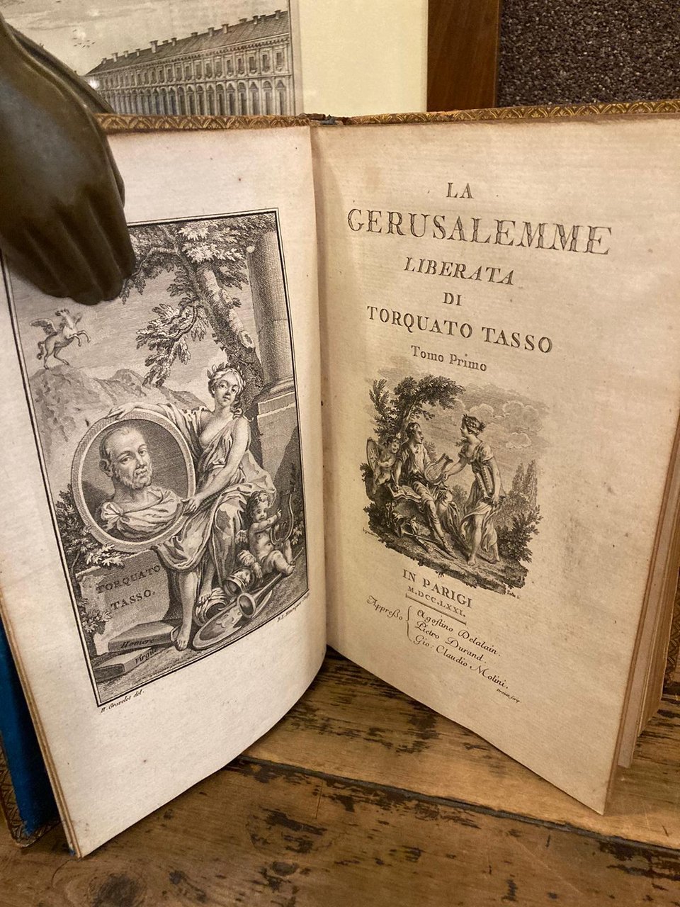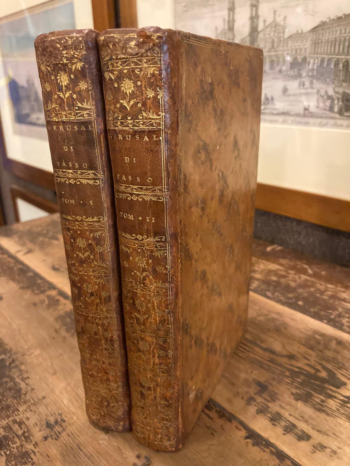 2 volumi in-8° (230x148mm), pp. (4), 331, (3); (4), 340, (2); legatura coeva p. pelle marmorizzata marrone con triplice ordine di filetti dorati lungo il perimetro dei piatti. Dorsi adorni di titolo e segnatura di volume in oro su doppio tassello rosso, ricchi fregi vegetali e floreali in oro. Tagli dorati. Risguardi azzurri. 2 antiporte con ritratti del Tasso e di Gravelot, 2 frontespizi incisi con vignetta, una dedica incisa con vignetta, 20 stupende tavole a piena pag. fuori testo, 9 grandi e 14 piccoli culs-de-lampe alla fine dei canti e 20 testatine con ritratto del personaggio e suo nome in italiano, Il tutto magistralmente disegnato da Gravelot e finemente inciso in rame da Baquoy, Duclos, Henriquez, Le Roy ed altri artisti. Normali fioriture e bruniture. Magnifica edizione, ritenuta, insieme al Boccaccio del 1757, il capolavoro tipografico del Settecento francese dedicato alla letteratura italiana. Tassiana di Bergamo, 277. Cohen / De Ricci, 974-975: 'Très belle édition publiée par G. Conti, avec illustrations superbes. Il faut prendre les vignettes en-tete avec les noms en italien, car on a fait pour l'édition française un tirage postèrieur, qui est beaucoup moins bon et où les noms sont imprimés en français'. Olschki, Choix, XII,18740. Gamba, 948.