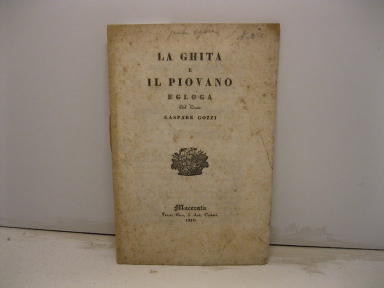 In 16, pp. 15 + (1b). Br. muta. L'egloga di Gaspare Gozzi, pubblicata in prima edizione a Venezia presso Colombani nel 1760, e' qui ristampata dal conte Armaroli come omaggio a 'Marco Cavallini patrizio di Cingoli all'opportunita' delle sue ben augurate nozze colla nobil Donzella la Contessa Teresa Mucciolanti di detta citta'. Il testo dell'egloga e' preceduto da un'introduzione beneaugurante per i due sposi. Gaspare Gozzi (Venezia, 1713 - Padova,1786), letterato, poeta e traduttore partecipo' alla fondazione dell'Accademia dei Granelleschi.