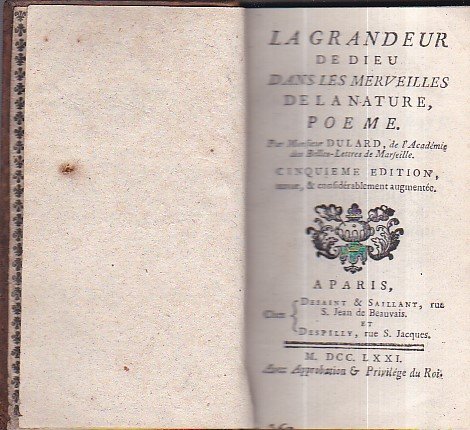 In-16° (148x80mm), pp. XXVIII, (2), 376, (4), legatura coeva p. pelle marezzata con filetti, fregi floreali e titolo in oro su tassello rosso al dorso. Tagli rossi a spruzzo. Piccolo fregio al frontespizio. Al contropiatto, etichetta di premio scolastico in data 26 agosto 1774. Al verso del foglio del titolo, antico timbro di possesso privato di Camille Bouquet Despagny. Testatine e finalini ornati e arabescati. Bell'esemplare. Quinta edizione (la prima è del 1749), riveduta e parzialmente originale, di questo poema in sette canti in alessandrini inteso a celebrare liricamente le bellezze della natura come specchio della grandezza divina. Ogni canto è preceduto da un sommario. Interessante, nel poema, la descrizione di una pestilenza, uno dei passi più ispirati in una versificazione, nell'insieme, piuttosto compassata. Il Dulard (Marsiglia, 1696-1760) fu segretario dell'Accademia di Belle Lettere di Marsiglia. Il suo nome è legato precipuamente a quest'opera; le sue 'Oeuvres diverses' apparvero in 2 volumi nel 1758. Fabien Pillet in Michaud, 'Biogr. universelle', XII, p. 200.