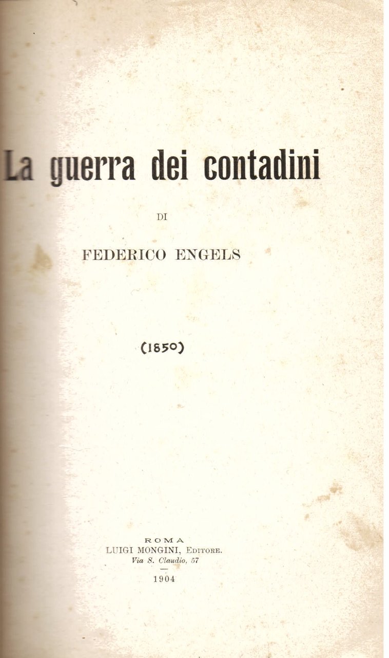 Fascicolo in-8° (cm 24x17), pp 83 (1) bianca, legato in cartoncino leggero editoriale d'attesa con titoli e tipi su tasselli cartacei applicati al piatto anteriore. Minimi difetti ai piatti, lievi fioriture a poche carte ma interno fresco: genuino esemplare ad ampi margini. Rara prima edizione italiana uscita come fascicolo de Scritti di C. Marx, F. Engels e F. Lassalle / tradotti in italiano e pubblicati insieme a lavori illustrativi per cura di Ettore Ciccotti, opera formata da uscite quindicinali di uno o più fascicoli. Fondamentale saggio scritto a Londra nel 1850 'sotto l'immediata impressione della controrivoluzione' (causata dai movimenti rivoluzionari dei lavoratori francesi del 1848-50) originariamente uscito sulla Gazzetta Renana (indi ristampato nel 1874 con una nuova introduzione dell'autore). Engels muovendo dai lavori di Zimmermann ricostruisce la guerra dei contadini che scosse la Germania (e alcune zone della Svizzera e dell'Austria nonché l'attuale Trentino Alto Adige) tra il 1524 e il 1526, da un lato, contestualizzandola nel più ampio movimento Riformista, mettendo dunque in risalto le innervazioni strutturali causanti un mutamento dell'assetto filosofico, religioso e culturale, dall'altro usandola come una sorta di 'laboratorio sperimentale' considerandola, pur con le dovute differenze, come prodromo delle lotte di classe ottocentesche.