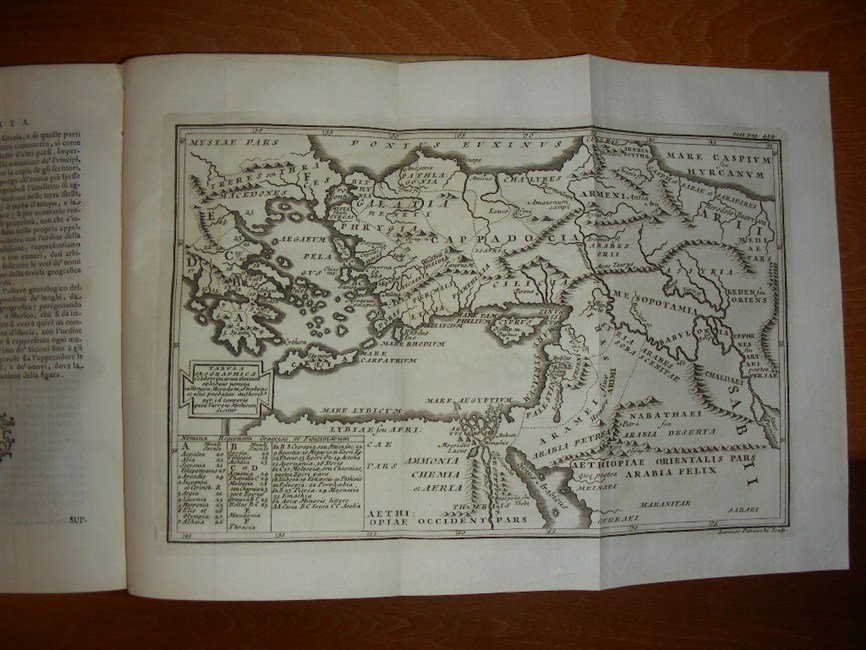 gr. vol. in-4, pp. (28), 572, (22), bella leg. p. perg. coeva con tit. oro al d. Front. a due colori. Con 12 tavv. in rame, anche ripp., raffiguranti obelischi, antichità, figure di vasi, carte geografiche, medaglie e sepolcri. Con moltiss. incis. in rame anche n.t. tra cui 32 “immagini”, una per capitolo. Ritr. dell’A. inc. in rame a pag. 1. Bell’antip. in rame e vignetta al front. Fregi, testat. e final. xilogr. Dedicat. a Lodovico XV Re di Francia. Seconda ediz. curata da Antonio Giuseppe Barbazza che vi premette anche una biografia dello scrittore veronese tratta dalla Verona illustrata del Maffei. Data la rarità degli esemplari dell’ediz. orig. del 1697 il Barbazza ritenne necessario curarne una ristampa riproducendo gli stessi rami della prima, alcuni intagliati da Pietro Sante Bartoli e andati distrutti nel tempo. Importante opera archeologica sulla storia del mondo in cui l’A. si sofferma soprattutto sui monumenti dell’antichità, specialmente delle civiltà assira ed egiziana. L’opera rimase incompiuta dovendo arrivare fino a Carlo V. Fabia Borroni 18.2. Belliss. esempl. [180]