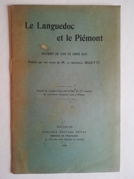 In 8 (cm 16 x 24,5), pp. 12. Dedica autografa al frontespizio. Brossura editoriale. Estratto editoriale da Compte-rendu des travaux du IV Congres du Sud-Ouest Navigable. Pubblicazione del rapporto del conte Cays circa la necessita' di costruire un canale a Cuneo per collegare la Stura e il Po in Piemonte. Il generale Lorenzo Bigotti fu studioso di navigazione interna e preparazione logistica.