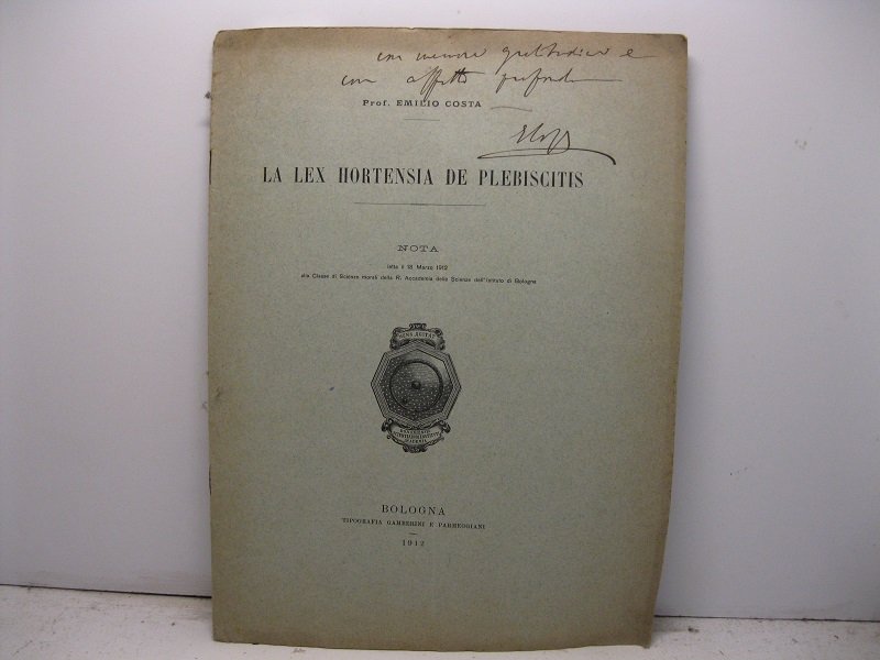In 4, pp. 11 + (1b). Dedica autogr. dell'A. al p. ant. Indirizzo di spedizione e affrancatura al p. post. Br. ed. Studio della Lex Hortensia De Plebiscitis promulgata nella Roma repubblicana a seguito di un conflitto fra patrizi e plebei. La legge imponeva che le deliberazioni prese durante il Concilium plebis fossero vincolanti per tutto il popolo romano.