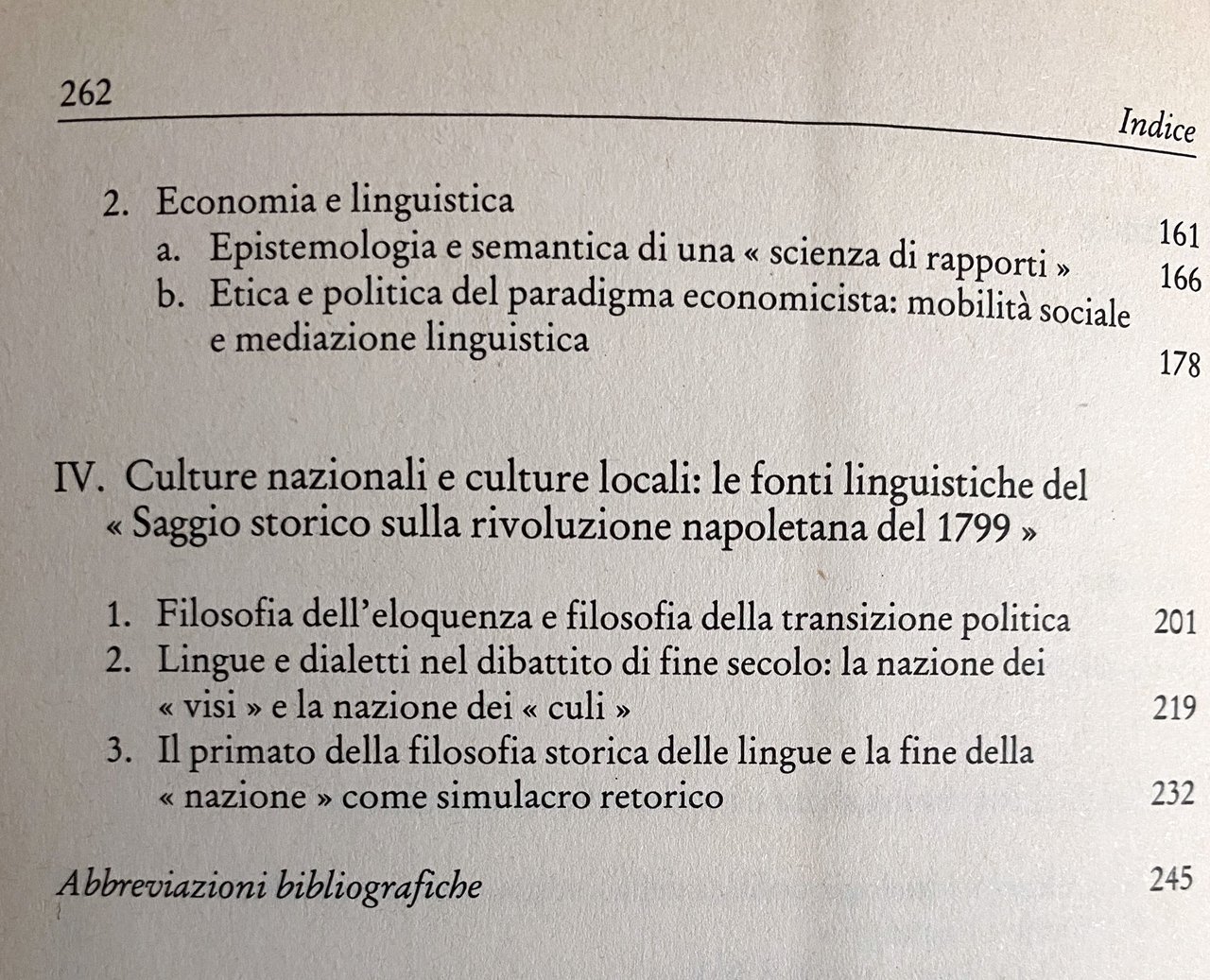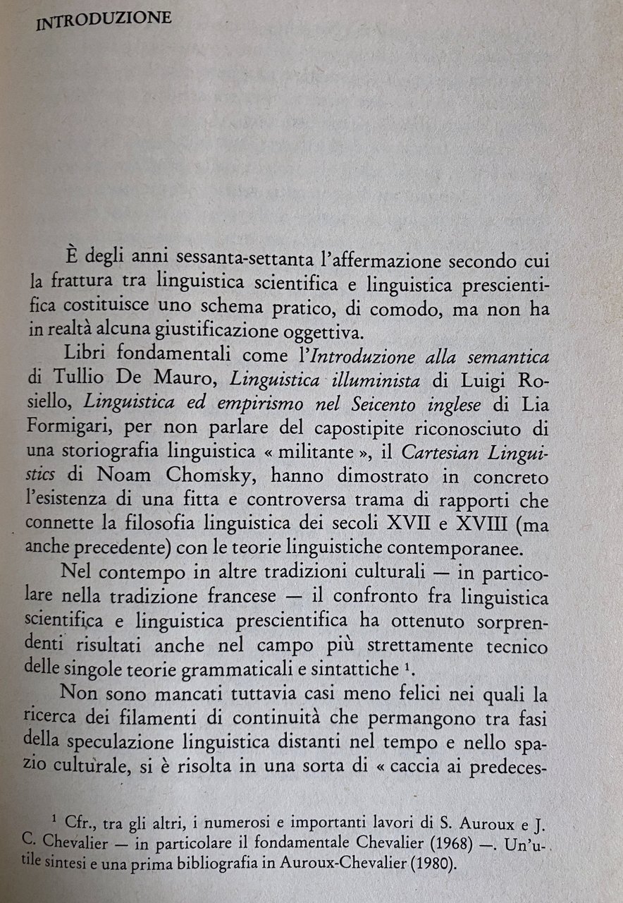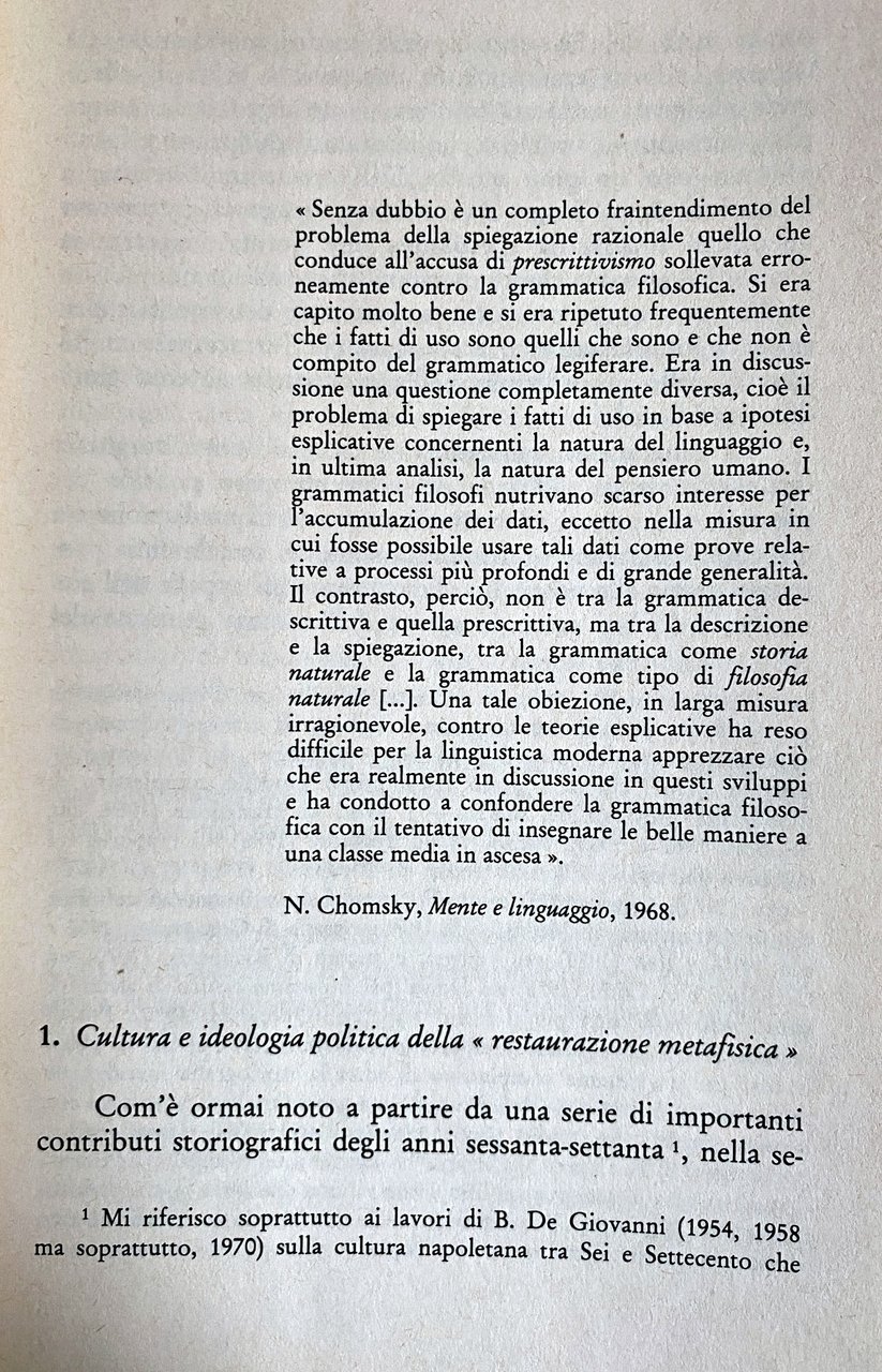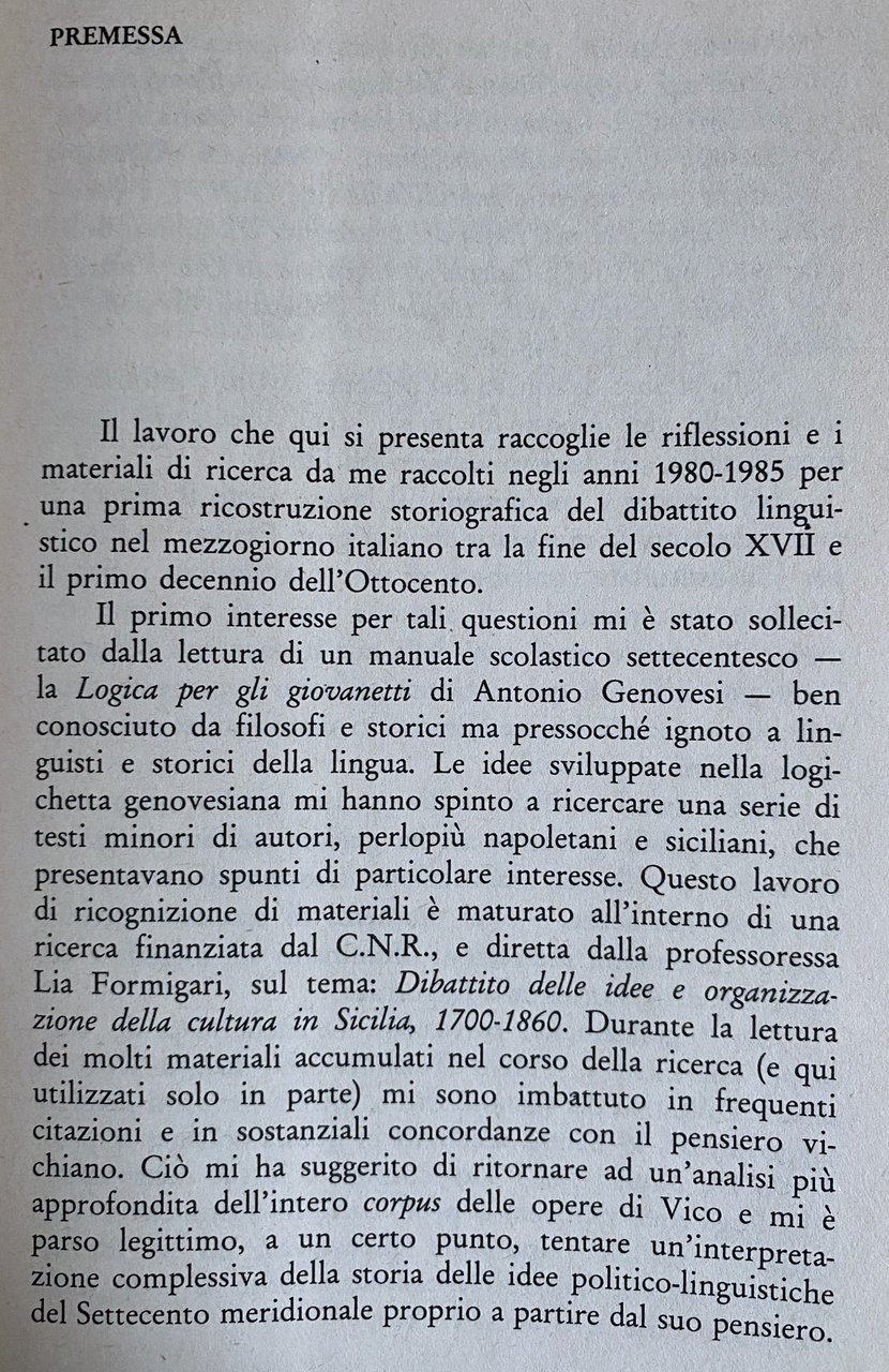 Soggetti: Linguistica Critica letteraria Filosofia del linguaggio Storia Vincenzo Cuoco Giambattista Vico Cultura meridionale Filologia Pietro Piovani Erudizione Storicismo Antonio Genovesi Semiotica Settecento Giacobini Napoli Ingenium Politica culturale Ferdinando Galiani Vero Verum Factum Fenomenologia Orazioni Mediazione Etica Mobilità 1799 Rivoluzione partenopea Dialetti Eloquenza Benedetto Croce Dialettologia Interpretazione Saggi storici Libri Vintage Fuori catalogo Storiografia Dibattito linguistico Logica per i giovanetti Mezzogiorno Studi culturali Meridionalismo Dibattiti Semantica Tullio De Mauro Luigi Rosiello Seicento Lia Formigari Cartesian Linguistics Noam Chomsky Teorie linguistiche Francese Grammatica Sintassi Auroux Chevalier Bibliografia Riferimento Consultazione Carlo Ginzburg Benvenuto Terracini Lo Piparo Biagio De Giovanni Intellettuali napoletani Dialetto Napoletano Lingue Pedagogia civile Didattica Trasmissione Ricuperati Migliorini Baldelli Ajello De constantia jurisprudentis Spinoza Matteo Egizio Barba Italiano Apprendimento Maffeo Pantaleoni Metafisica Errori Doria Integrazione Blanch Zambelli Scienza Nuova Torquato Tasso De Uno Geometria Parlato Divulgazione Speculazione Epistemologia Retorica Primato Poetica Wittgenstein Villani Villari Salviati Serio Timpanaro Giannone Pascal Gentile Jerocades Martinelli Gravina Galasso Delfico Einaudi Napoletana Repubblica Martiri Colletta Battaglia Ascoli Arnauld Abbagnano Aristotele Nazioni Conoscenza Mente Ideologia De Sanctis Dialettica Materialismo Monti Nobile Nobiltà Aristocrazia Popolo Campagna Città Istruzione Scuola Università Accademie Crusca Formazione Studiorum Latino Volgare Bartolomeo Intieri Diritto Giurisprudenza Studi giuridici Classi sociali Saggio storico Literary criticism Philosophy Language History Southern culture Philology Erudition Historicism Semiotics Eighteenth century Jacobins Naples Cultural politics Phenomenology Orations Mediation Ethics Neapolitan revolution Dialects Eloquence Dialectology Interpretation Historical essays Books Out of print Historiography Linguistic debate Studies Southernism Debates Semantics theories French Grammar Syntax Bibliography Reference Consultation Intellectuals Dialect Languages Civil pedagogy Didactics Transmission Italian Learning Metaphysics Errors Integration Geometry Spoken Dissemination Speculation Epistemology Rhetoric Primacy Poetics Republic Martyrs Knowledge Mind Ideology Dialectics Materialism Nobility Aristocracy People Countryside City Education School University Academies Formation Vernacular Law Jurisprudence Legal Social classes Essay