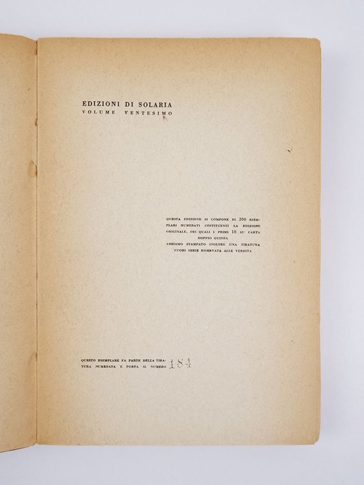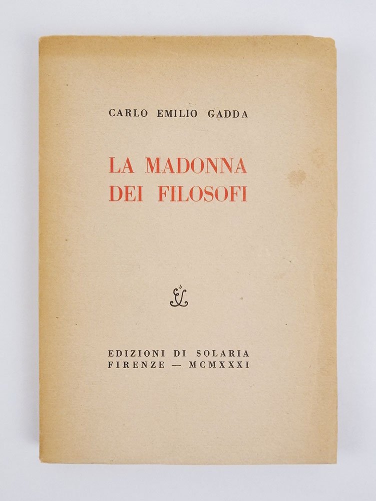 LIBROEdizione originale nella tiratura numerata.Esemplare numero 184 delle sole 200 numerate; infinitesimale mancanza all’angolino alto anteriore; uniforme brunitura perimetrale; nel complesso ottimo esemplare, dritto, squadrato e ancora a fogli chiusi.Come di consueto per le Edizioni di «Solaria», il libro fu stampato in una tiratura numerata da 1 a 200 (le prime dieci copie su carta di pregio) — «che costituisce l’edizione originale» — oltre a una tiratura non specificata «fuori serie, riservata alla vendita» (che tuttavia proprio nel caso dell’esordio gaddiano sappiamo in ottocento copie: cfr. «Lettere a Solaria», n. 423). -- Un primo cenno all’opera comparve già a dicembre 1928 in una lettera ad Alberto Carocci, il direttore di «Solaria». Gadda collaborava da qualche anno alla rivista, oltre che alla «Fiera letteraria» diretta da Umberto Fracchia: su questi due periodici escono infatti i primi scritti letterari del trentenne che lavorava come ingegnere e studiava per ottenere una seconda laurea in Filosofia (poi non conclusa). Nell’estate del 1929 Gadda firma il contratto: «Sono molto lieto di aver combinato perché sento che la pubblicazione del libro sarà un incentivo per continuare e poi la bella veste e il bel nome delle “Edizioni di Solaria” mi piace — e poi insomma sono contento di uscire con chi ha stampato per primo la mia roba» («Lettere a Solaria», n. 203). L’edizione si fece con il determinante contributo economico dell’autore, com’era abitudine di quelle edizioni, ma convinto sponsor dell’esordio gaddiano fu l’amico Bonaventura Tecchi — ex commilitone e compagno di prigionia, a Rastatt e Celle, durante la Prima guerra mondiale — pronto a insistere con Carocci affinché fossero concesse a Gadda le migliori condizioni («Fa come se dovessi pubblicare io, che sono azionista della Soc. Solaria […]. Tutti i vantaggi che potrei avere io […] dàlli a lui» scriverà nel luglio del ’29). -- Fin da subito, tuttavia, i rapporti tra Gadda e l'editore si fecero complicati: per la consegna del manoscritto si dovette attendere oltre un anno, e continuava a tardare la novella che avrebbe dovuto dare il titolo all’intera raccolta, l’inedito “Notte di luna” (sarà poi parte de “La meccanica”, pubblicato solo nel 1970). Nel marzo del 1931 — lo stesso mese, cioè, del finito di stampare del libro, che in realtà uscì in aprile — Gadda comunicò ad Alessandro Bonsanti, il redattore principale di «Solaria», che la novella non era pubblicabile e che dunque il libro andava considerato finito così com'era; con un nuovo titolo però: «Madonna dei filosofi». Bonsanti accolse la notizia con distinto aplomb, procedendo di corsa alla lavorazione e commercializzazione dell’opera («Carteggio Bonsanti Gadda», pp. 9 e seguenti). -- L’iniziale accoglienza, per quanto piuttosto limitata, fu premiata da due autorevoli promozioni, quella di De Robertis su «Pegaso» 3/6 (giugno) e quella di Franchi sull’«Italia letteraria» del 9 agosto. «La madonna dei filosofi» verrà poi ripubblicato da Einaudi nel 1955 (nella raccolta «I sogni e la folgore»), quindi di nuovo autonomo nel 1963: da allora non si è mai smesso di ristamparlo.Sebastiani, Catalogo Gadda, n. A I; Lettere a Solaria (Roma 1979), ad indicem; Carteggio Bonsanti Gadda (Firenze 2021), pp. 5-15