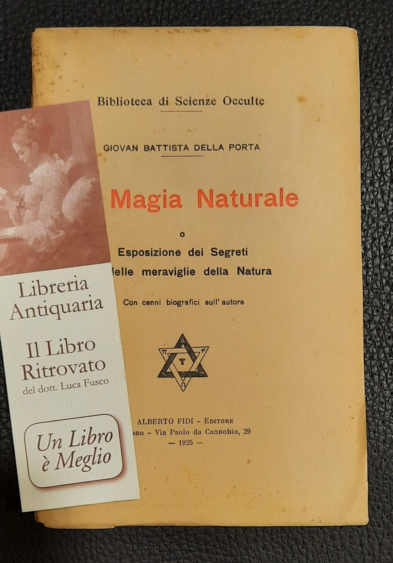 Prima Edizione. Milano-Alberto Fidi, 1925 in 8° pp. 255. Dall'indice: Della simpatia e dell’antipatia; Alcune proprietà dei luoghi e delle fontane; Sui mezzi per ottenere frutti e fiori primaticci, tardivi, senza bucce e senza noccioli, più dolci (noci senza guscio, carciofi senza spine, zucca senza semi); Come far cambiare colore ai fiori; Il veleno dei rospi; Contro le morsicature di animali; Come togliere l’appetito; Lampade e candele; Virtù della putrefazioni; Suoni; Sogni; Sulla calcinazione e sublimazione; Metalli e pietre preziose (calcedonia, turchese, diamante, ambra, rubino); Gli specchi concavi. Intonso. Brossura editoriale. Perfette condizioni.