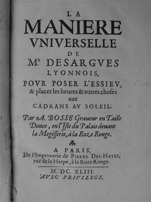 LA MANIERE UNIVERSELLE DE M. Lyonnois, pour poser l’essiev, et placer les heures et autres choses aux cadrans au soleil. Par A. Bosse graveur en taille douce, et l’isle du Palais devant la Megisserie, a la roze rouge.