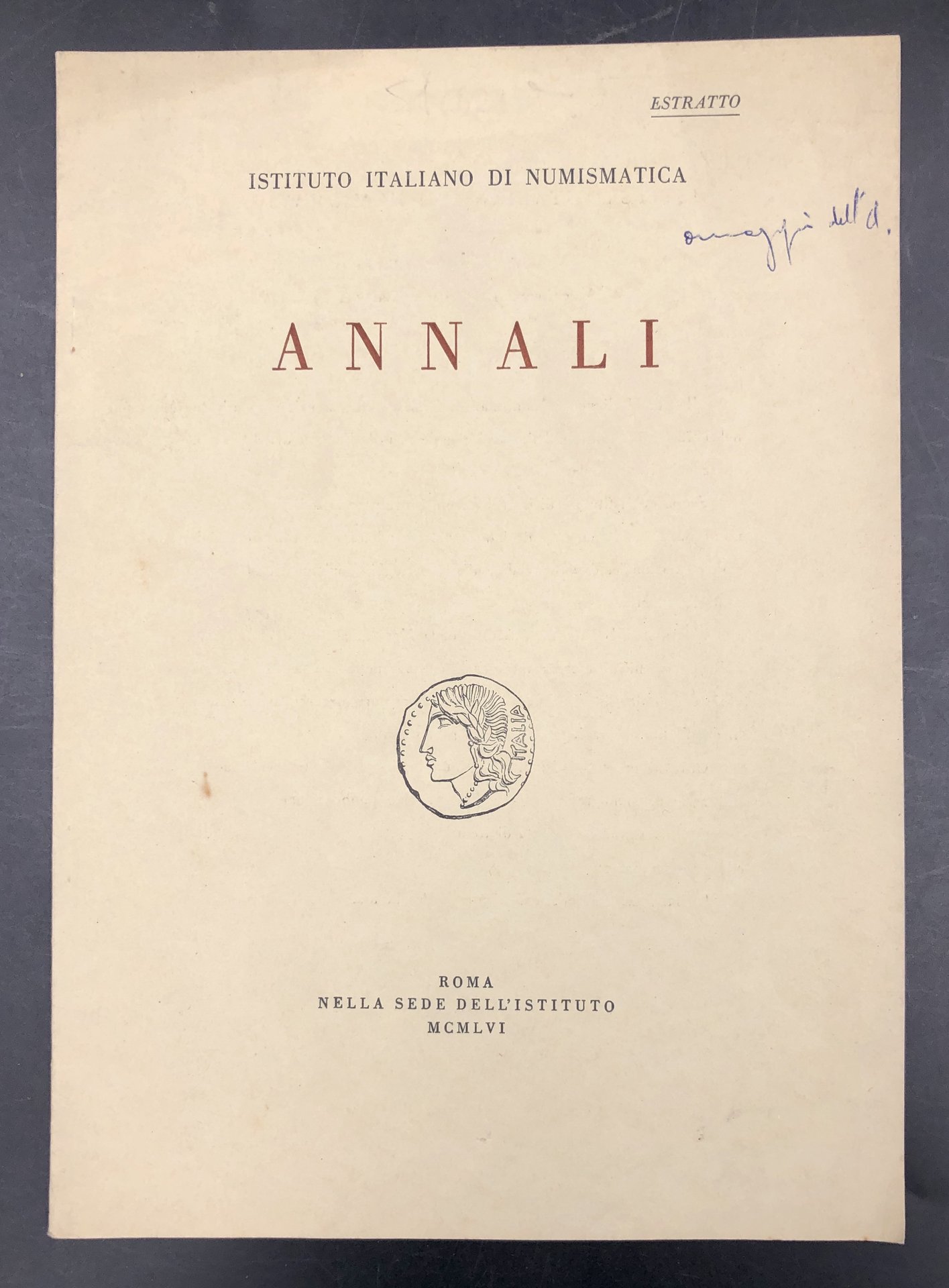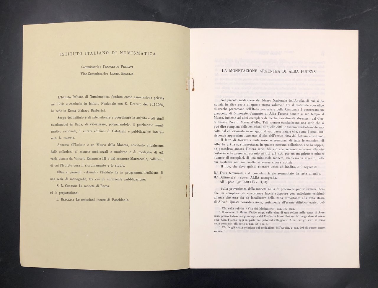 La MONETAZIONE ARGENTEA di ALBA FUCENS. Estratto orig. da Ist. It. di Numismatica - Annali, 1956. In cop. INVIO AUTOGRAFO "omaggio dell'A.).