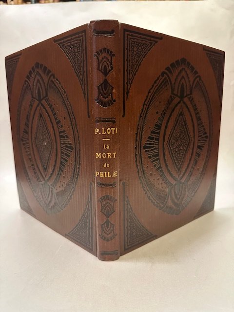 Bellissima legatura coeva firmata René Kieffer in tutta pelle, piatti con ricchi motivi floreali in impressione a due colori, dorso con titolo in oro al centro e motivi floreali, sguardie in carta dipinta, taglio superiore dorato, conservate le brossure e il dorso originali, cofanetto rigido in carta decorata dipinta come le sguardie, ottima conservazione. Bellissime acqueforti a piena pagina e di diverso colore raffiguranti ambientazioni egizie. Uno dei 460 esemplari sur Velin à la forme (359).