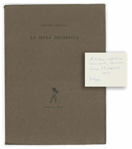 LIBROEdizione originale.CON AUTOGRAFO.Esemplare n. 31 di 300, in ottime condizioni, ben completo dell’autografo dell’autore al colophon, parzialmente a fogli chiusi.Raccolta di brevi prose e versi ornata da tre disegni in bianco e nero di Filippo de Cousandier nel testo. Tiratura di 300 esemplari numerati a macchia e controfirmati dall’autore. Pubblicato come supplemento al fascicolo novembre-dicembre 1958 di «Marsia. Rivista di critica e letteratura» diretta da A. Dommarco.