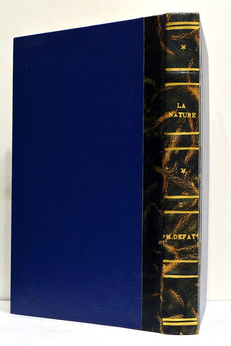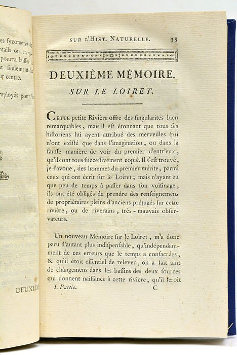 VIII. 221 pages. 1 feuillet. (20x13,5 Cm). Demi-basane bleue et verte. Reliure postérieure. Dos lisse doré. Coiffes un peu émoussées. Intéressant recueil d'observations curieuses sur l'histoire naturelle, réalisées pour la plupart à Orléans et dans ses alentours. Il contient notamment un mémoire sur la rivière du Loiret et ses poissons, "sur une Rose rouge monstrueuse", ainsi que la relation de diverses bizarreries de la nature: écrevisses bleues, lapins jaunes, alouette à trois pattes, pigeon avec quatre cuisses, œuf cylindrique de poule, etc. Une partie est consacrée à la Minéralogie de l'Orléanais dans laquelle l'auteur détaille les particularités minéralogiques et géologiques des villages de la région. Rares taches et rousseurs. Exemplaire très bien conservé.