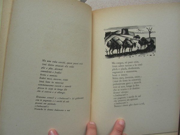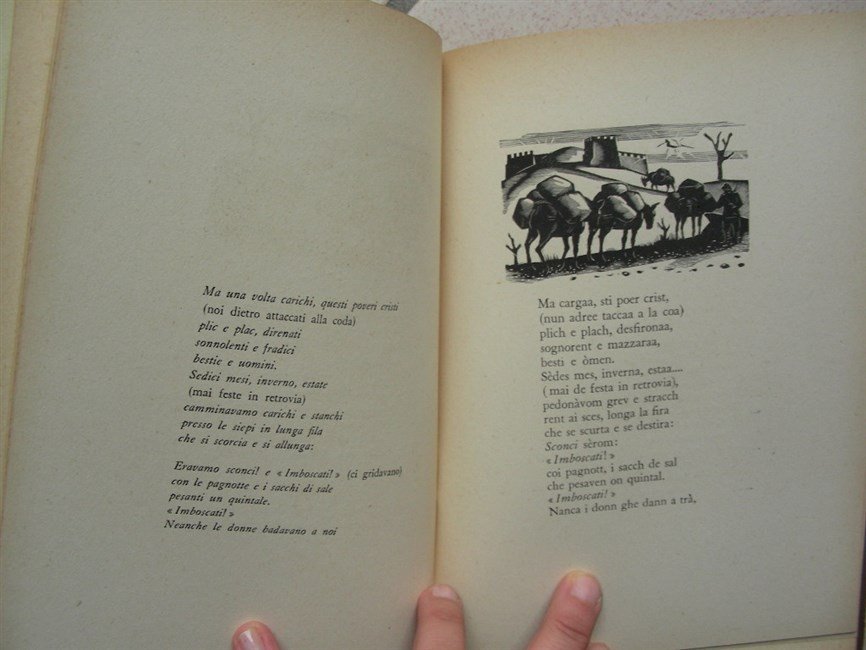 in-8, pp. 10 nn., leg. p. pelle coeva con tit. oro al piatto ant. All’interno conservate le cop. orig. Con xilogr. orig. di Italo Zetti. Testo in vernacolo con traduz. italiana a fronte. Esempl. a tiratura limitata non numerato, ma uno dei 10 rilegati in p. pelle. Ricordi in versi dialettali della località di Nove sul Brenta. Dorso scollato e conservato all’interno, da restaurare.