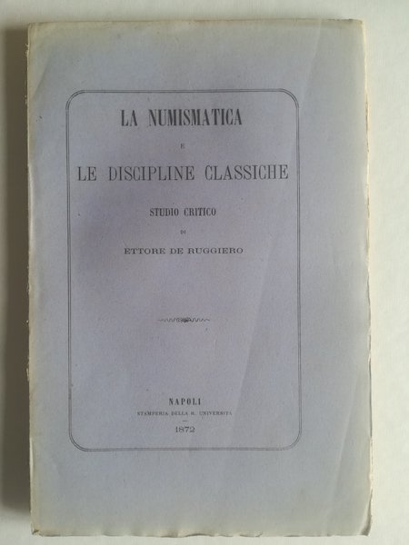 In 8 (cm 16 x 24), pp. 73 + (3b). Qualche fioritura sparsa alle pagine. Pagine intonse. Brossura editoriale. Interessante saggio di questo archeologo dedicato ai vari aspetti e utilizzi della numismatica e delle monete come opera d'arte e come valore monetario. De Ruggiero fu un archeologo napoletano, storico ed epigrafista, allievo di Mommsen, docente alle Universita' di Napoli e di Roma.