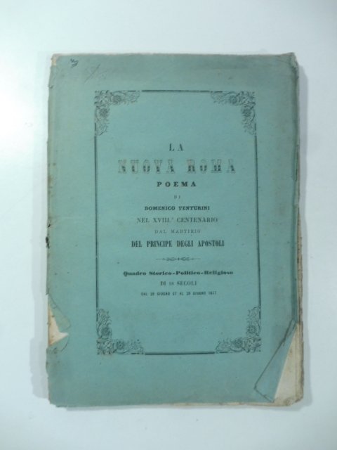 In 8 (cm 14 x 20,5), pp. 102 + (2). Brossura editoriale con danni riparati al dorso. "Il Ch. autore di questo poema scorre con limpido verso la storia di 18 secoli e canta le lotte, i patimenti, le vittorie e le gioie di Roma Cristiana. La poesia ci piacque e ci conforto' l'animo il ricordo di altri tempi piu' del nostro terribili e burrascosi. Le vittorie di Roma sono tante e tali da renderci sicuri che saranno seguite da sempre nuove glorie e che la nuova Roma di San Pietro, ben a ragione grande ed eterna piu' di quella di Romolo, salvera' ancora la civilta' e sara' forte scudo contro la barbarie dell'incredulismo che ci minaccia" (Cfr. 'Il Diritto Cattolico', 29 agosto 1867).