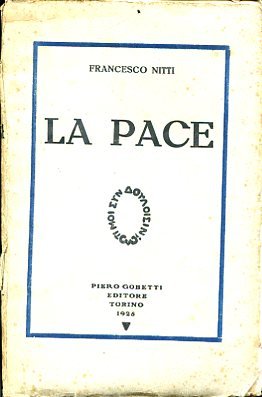 In-8°, pp. 235, (4), brossura originale riquadrata con titolo e logo editoriale, disegnato da Casorati, col motto greco disposto circolarmente: 'Ti moi sun douloisin ?', 'Che cosa ho io a che fare con gli schiavi ?', implicito riferimento alla dittatura fascista. Ritratto fotografico di Nitti in antiporta. Restauri al dorso. L'occhietto e l'ultima carta sono incollati al risguardo. Buon esemplare. Prima edizione di questo studio nittiano sul problema della pace e del pacifismo diversi anni dopo il termine della Prima Guerra Mondiale, e in cui l'idea di pace è posta come fattore unificante delle nazioni europee, in una delle maggiori dichiarazioni europeiste espresse in quegli anni dalla pubblicistica italiana (l'ultimo capitolo è un espresso vagheggiamento degli Stati Uniti d'Europa). Tiratura di 15.000 esemplari. Indice: Cattivi pastori. I dirigenti dei popoli dopo la guerra. Il fallimento della guerra. Il fallimento della pace di guerra. La pace di guerra. La violazione dei trattati prima durante e dopo la guerra. Le illusioni sulla pace: la maniera forte e la maniera abile. La lotta tra il principio della distruzione e il principio della vita. Le vie che menano alla pace. Il ritorno ai principi di libertà e di democrazia. Gli Stati Uniti di Europa. Accame Lanzillotta, n. 56.