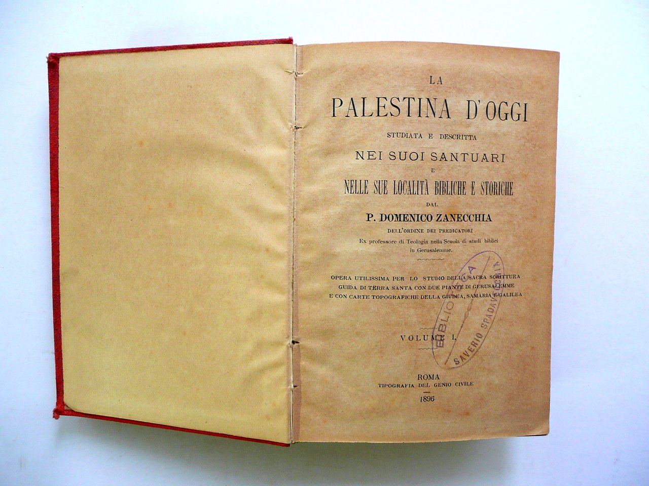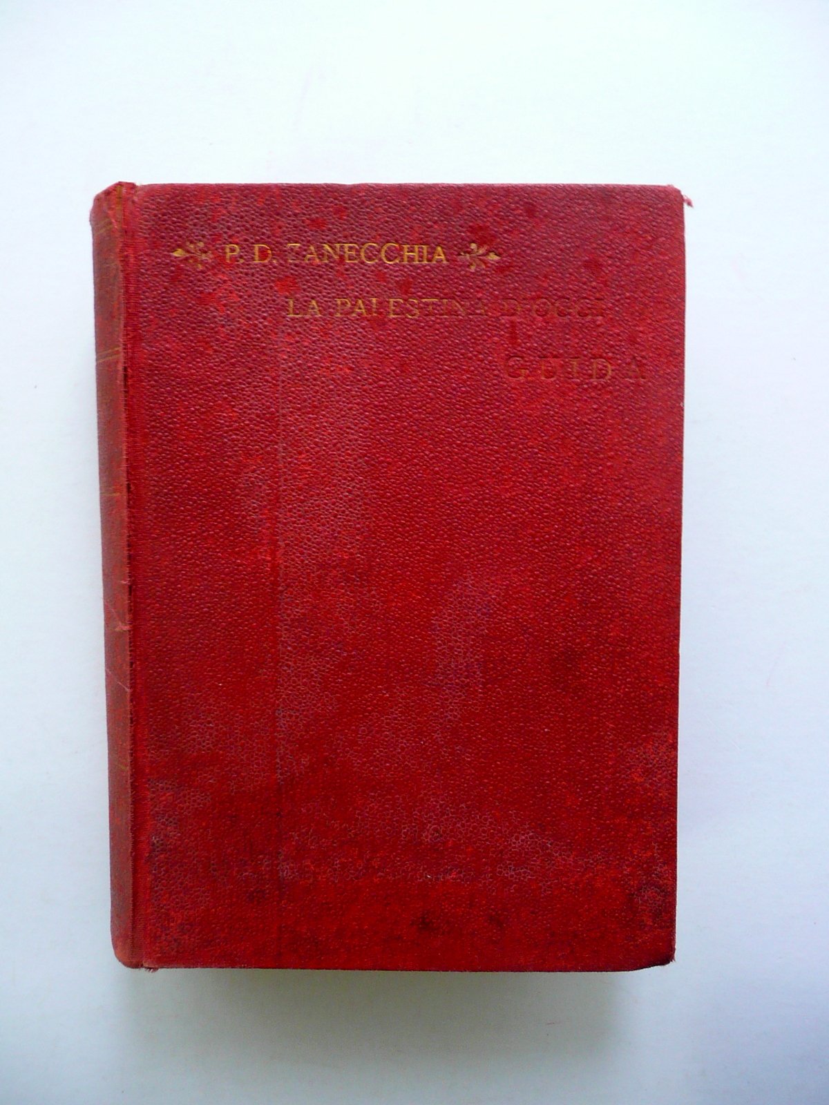 P. Domenico Zanecchia, † La Palestina d'Oggi studiata e descritta nei suoi santuari e nelle sue localit‡ bibliche e storiche dal P. Domenico Zanecchia dell'ordine dei predicatori ex professore di Teologia nella Scuola di studi biblici in Gerusalemme opera utilissima per lo studio della sacra scrittura - guida di terra santa con due piante di Gerusalemme e con carte topografiche della Giudea, Samaria e Galilea volume I - II (opera completa in due volumi) Tip. del Genio Civile, Roma 1896; cm 18x12,5; pp. X-382 pi˘ due carte con dettagli a colori rip. pi˘ volte (volume I); pp. 546 pi˘ tre carte a colori ripiegate pi˘ volte (volume II); legatura d'epoca in tutta tela con titolo impresso in oro al dorso e al piatto ant. Risguardo ant., frontespizio e pagina I del primo volume con timbro - ex libris del precedente proprietario. Opera completa in due volumi rilegati insieme (vedi foto). † Condizioni di conservazione Esemplare complessivamente in buone condizioni con tracce d'uso, coperta con alcune leggere abrasioni e qualche piccolo alone, minuscoli strappetti agli angoli dei piatti; cerniera post. con una fessurazione di alcuni cm, esemplare compatto. Piccole parziali perdite alla doratura dei titoli e dei fregi. Interni buoni con alcune piccole leggere bruniture, lievemente ingialliti a causa del tipo di carta; pp. 513-524 del volume II con uno strappetto alla parte inferiore, molto marginale, che non interessa il testo (vedi foto). † Opera completa in due volumi entro un'unica legatura, rara nella sua prima edizione, corredata da 5 belle carte totali ripiegate pi˘ volte (vedi foto). † SETT197.L19047 N